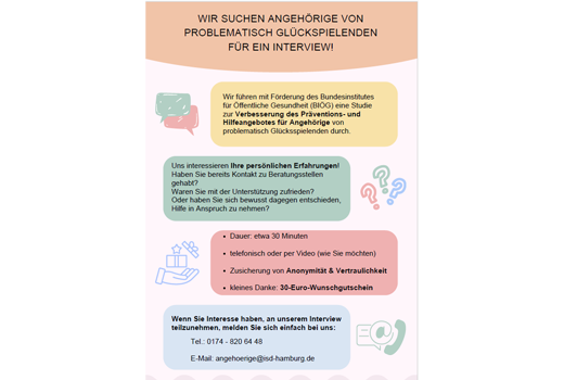 Ausführliche Informationen zu Spielformen, Risiken und rechtlichen Aspekten finden Sie im Bereich Glücksspiele. Der Abschnitt Glücksspielsucht beleuchtet Risikofaktoren, die Entstehung einer Suchterkrankung, mögliche Folgen und vieles mehr. Mit unserem Selbsttest können Sie Ihr eigenes Spielverhalten besser einschätzen. Tipps und vielfältige Unterstützungsangebote finden Sie außerdem im Bereich Hilfe.